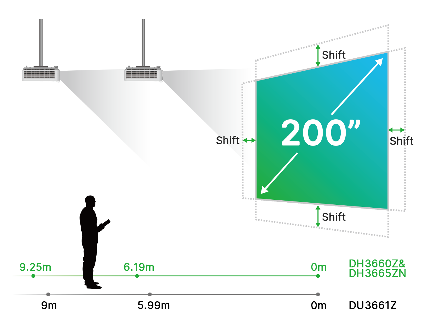 The DH3665ZN is equipped with a 1.5X big zoom optical lens and supports a throw ratio of 1.39 to 2.09:1. It can provide flexible projection distance installation in any challenging environments. With the horizontal/ vertical lens shift, even if the projector cannot be placed in the middle position, it can be flexibly adjusted to provide a perfect ratio image.