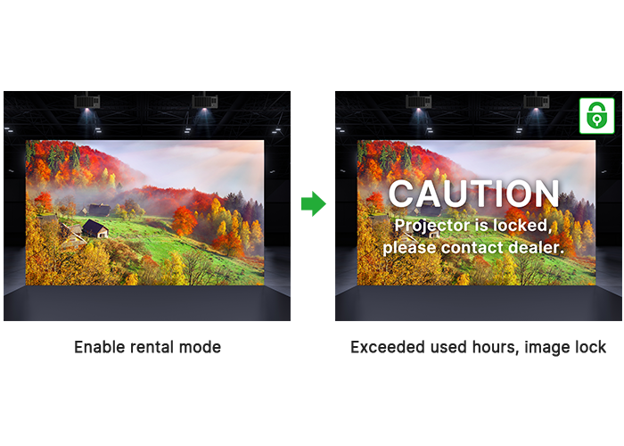 After rental agents installed the projectors for customers, rental period can be set, and the screen image will be automatically blocked when the period expires.